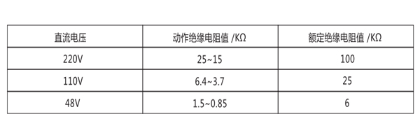 繼電器動作值:當母線任何一側對地絕緣電阻下降到下表值時,繼電器應可靠動作并有相應的動作指示。