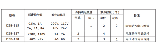 DZB-115帶保持中間繼電器的參數見下表